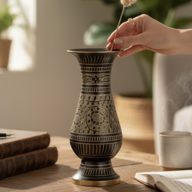 Представьте, как в интерьере появляется предмет, который притягивает взгляды и рассказывает историю многовековых ремёсел. Именно такой станет латунная ваза с гравировкой — подлинное произведение индийских мастеров.