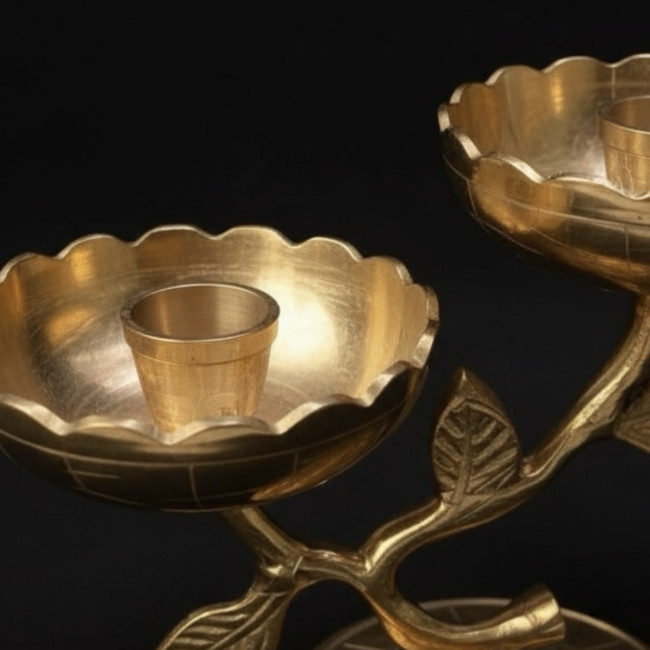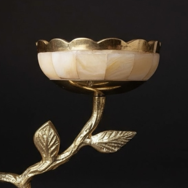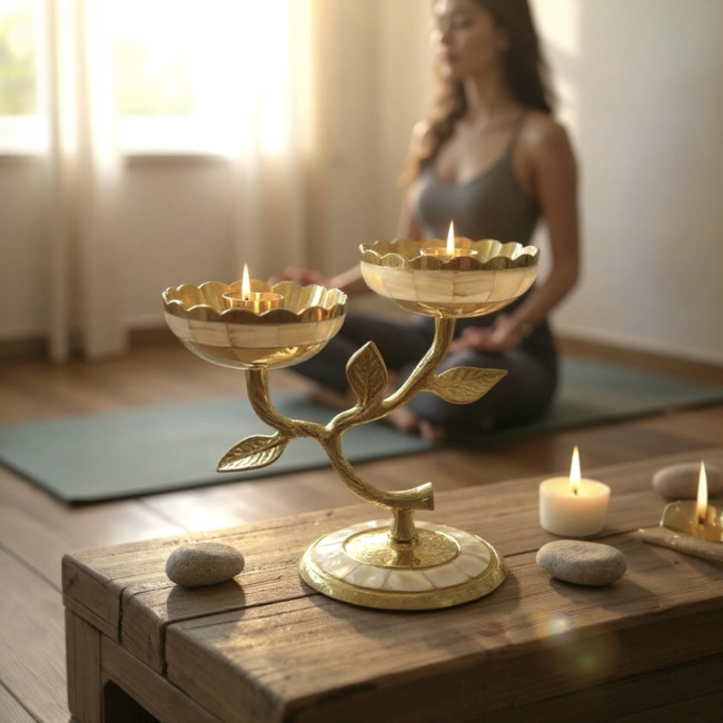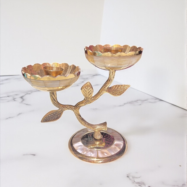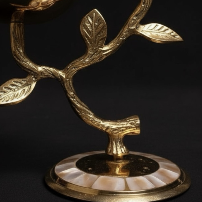 Откройте для себя истинное великолепие индийского ремесленного искусства с уникальным подсвечником из благородной латуни, украшенным изысканной инкрустацией из натурального перламутра.